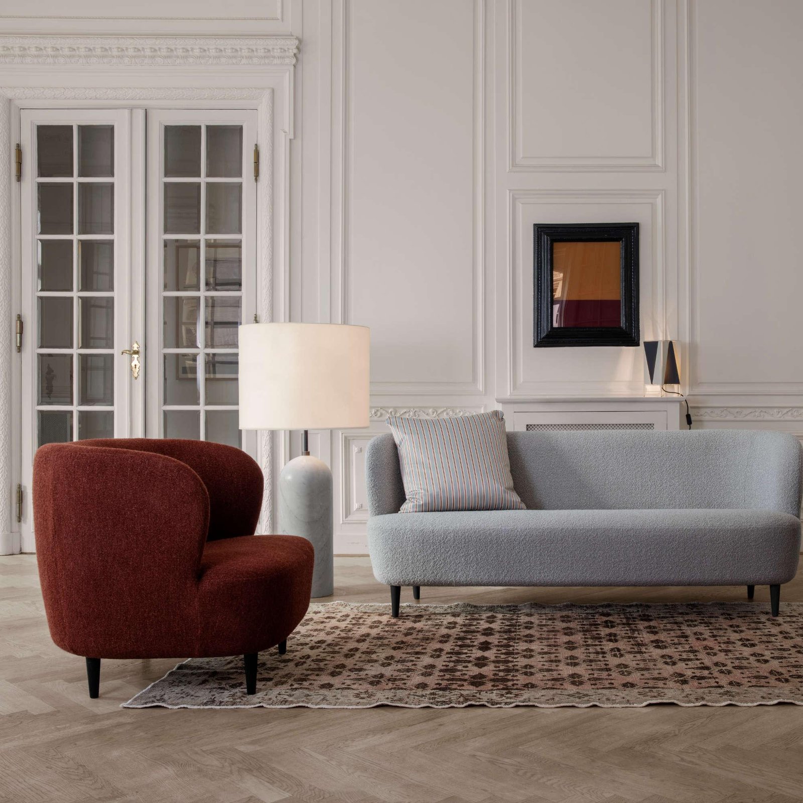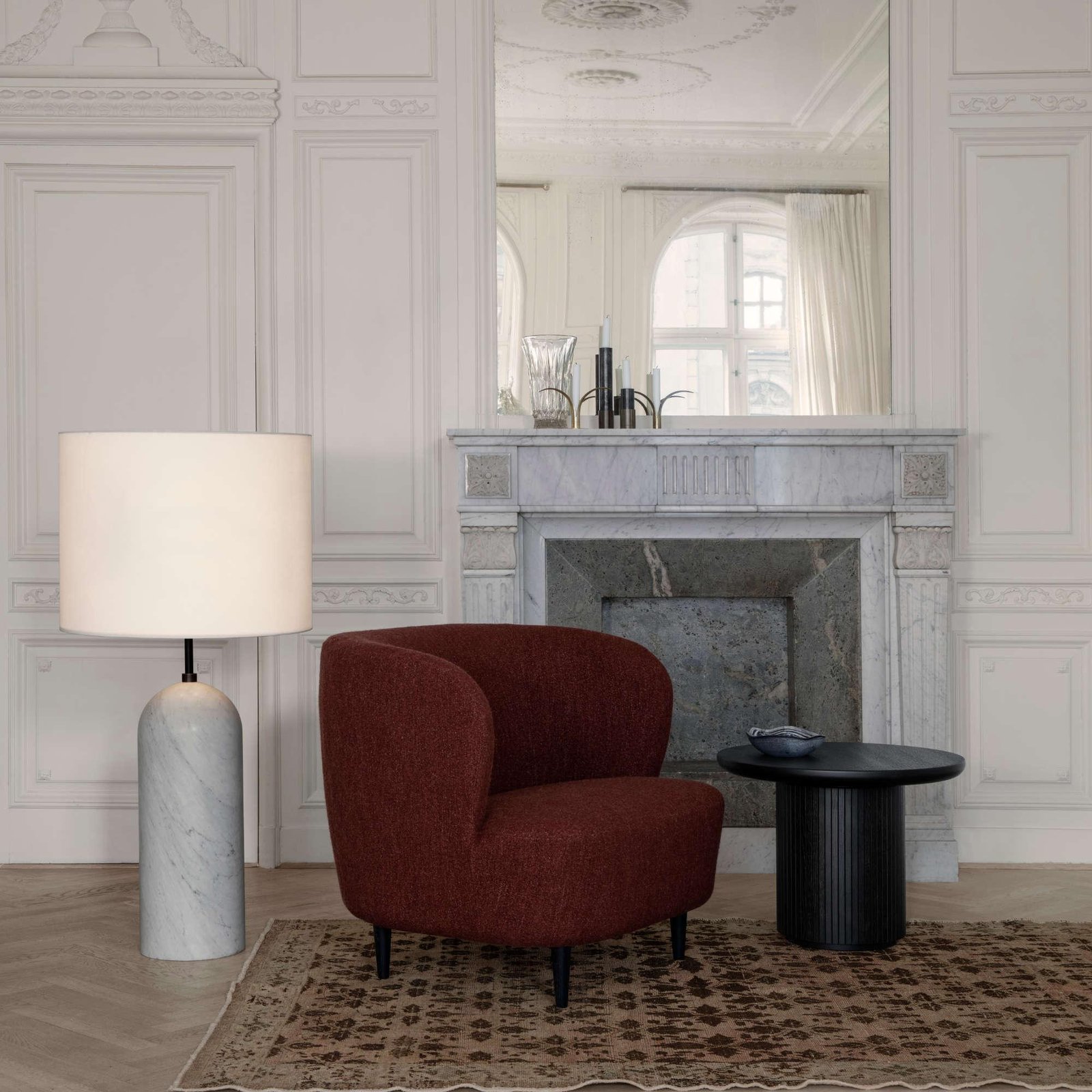 The Gravity XL Floor Lamp, designed by Space Copenhagen, is aesthetically contrasting strength and fragility. Taking its name from the lamp’s distinctive balance between the anchoring of the heavy, cylindrical base and the lightweight, airy shade, it beautifully merges into a sculptural whole.