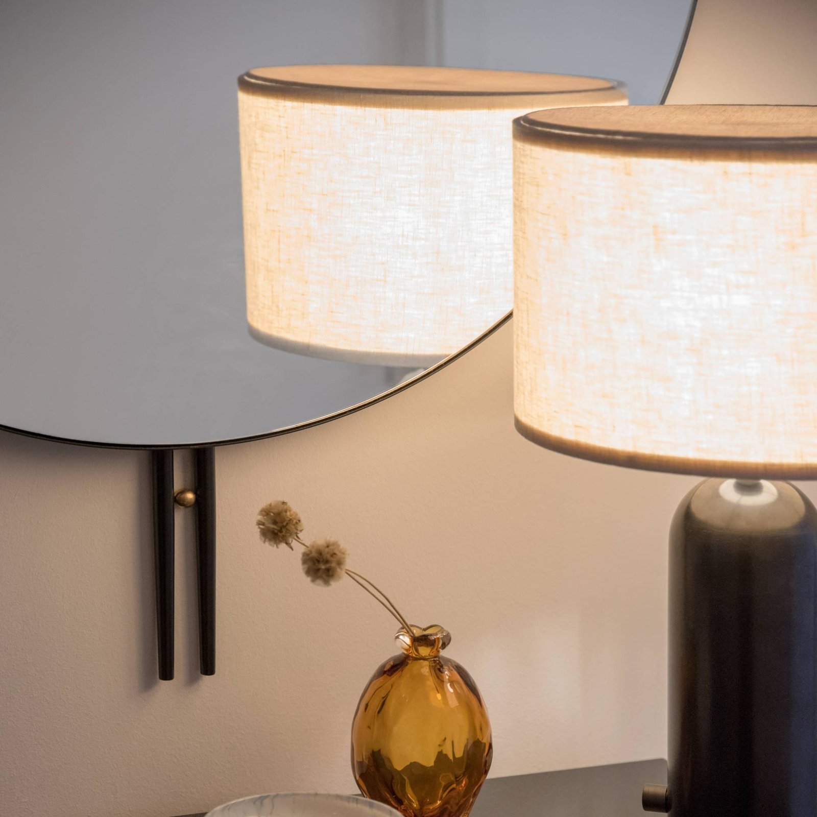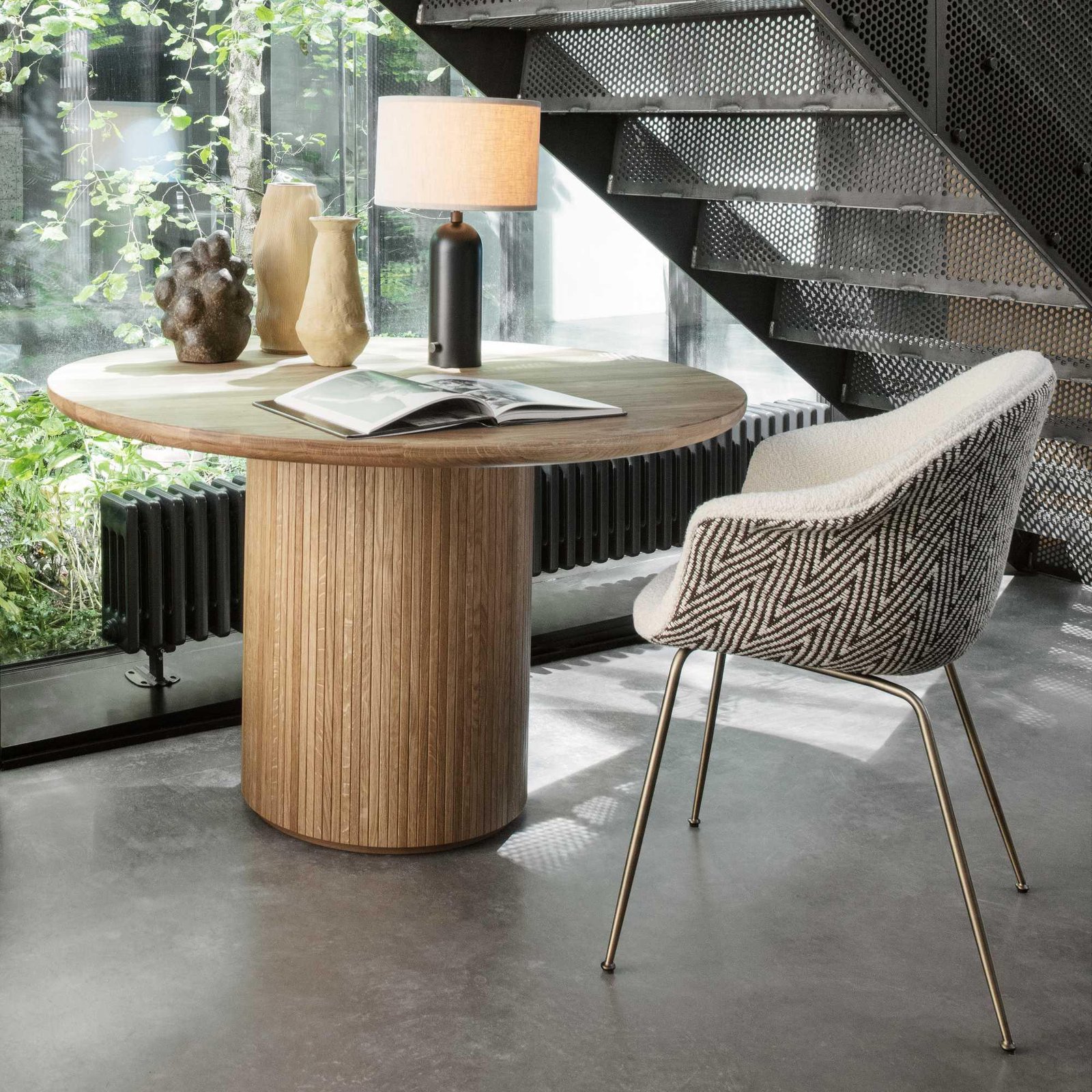 The Gravity Table Lamp, designed by Space Copenhagen, is aesthetically contrasting strength and fragility. Taking its name from the lamp’s distinctive balance between the anchoring of the heavy, cylindrical base and the lightweight, airy shade, it beautifully merges into a sculptural whole.