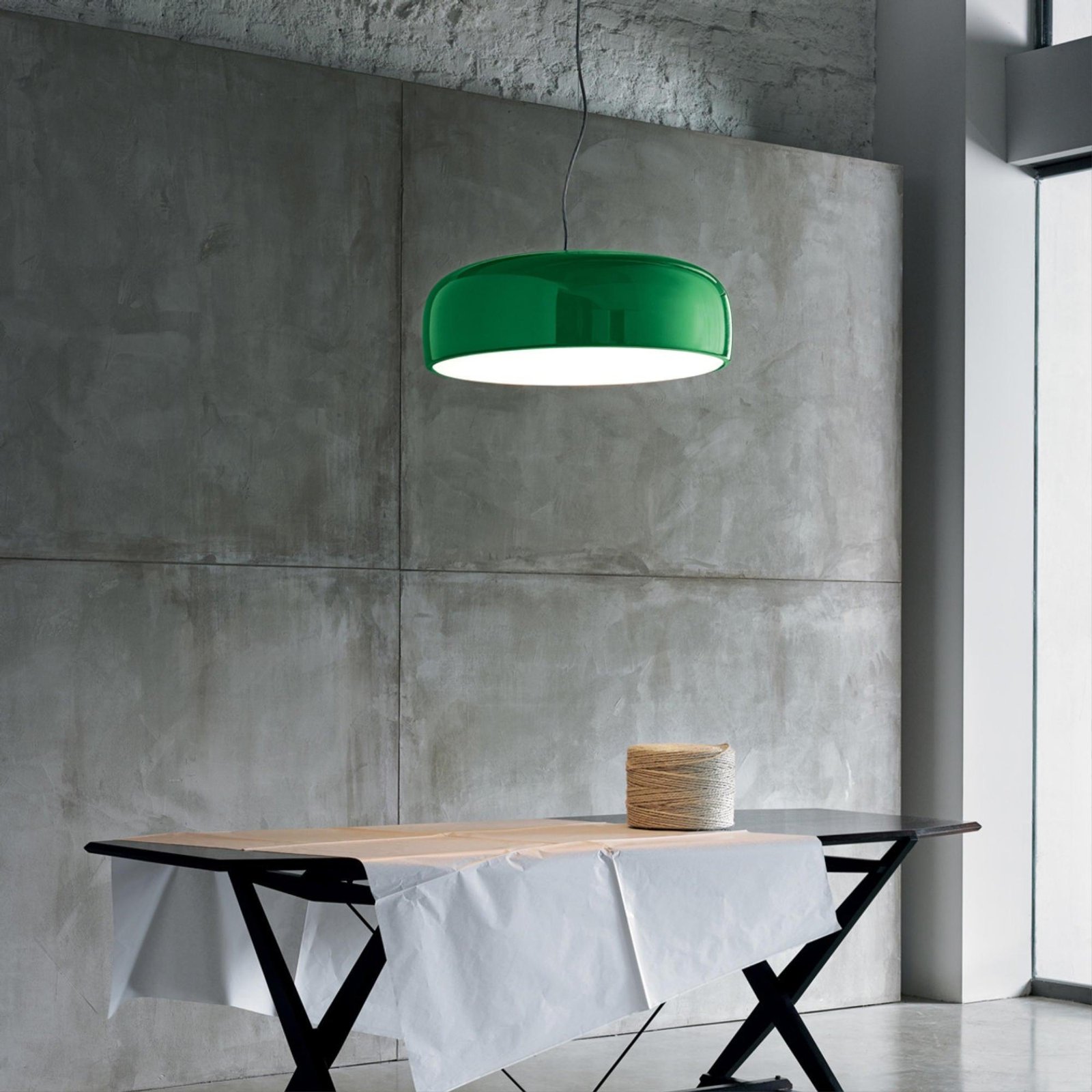 Suspension lamp with direct light. Aluminium body. Available in gloss black,matt black, red, green, white or MUD. Injection-moulded opalescent methacrylate diffuser. Steel ceiling attachment with steel suspension cable, 5 pole electric cable in PTFE double insulation, working length 2700 mm.